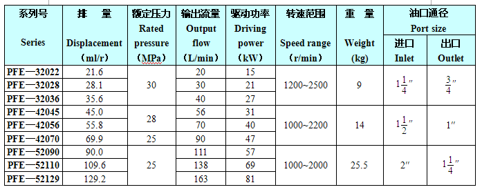 PFE系列注銷式葉片泵█簡介 PFE系列高性能葉片泵,共有單泵(PFE—31/41/ 51/32/42/52)及雙聯(lián)泵(PFED—4131/5141)八個(gè)系列75個(gè)規(guī)格。其排量范圍為16.5~150ml/r,額定壓力為21~30Mpa,轉(zhuǎn)速范圍為600~2800r/min(在此基礎(chǔ)上,本公司又研制出PFE—21/61兩個(gè)系列單泵、PFED—3121/4121/5121/5131四個(gè)系列雙聯(lián)泵以及PFET—41/51兩個(gè)系列通軸泵,使排量范圍擴(kuò)展為5~250ml/r)。該泵設(shè)計(jì)工藝獨(dú)特,采用偏心柱銷式葉片結(jié)構(gòu),具有壓力高、流量大、體積小、運(yùn)轉(zhuǎn)平穩(wěn)、噪聲低、效率高、壽命長等一系列優(yōu)點(diǎn),主要技術(shù)指標(biāo)達(dá)到國際同類產(chǎn)品先進(jìn)水平。 該系列泵為插裝式結(jié)構(gòu)。機(jī)芯的最佳設(shè)計(jì),進(jìn)一步降低了壓力、流量脈動(dòng)及噪聲。前后側(cè)板結(jié)構(gòu)相同,具有對(duì)稱的溝槽,且都采用液壓平衡,保證了一致的變形和補(bǔ)償,從而可以獲得更好的容積效率。葉片及柱銷根部供油系統(tǒng)的合理設(shè)計(jì),保證了葉片與定子間的良好接觸,并使得流量損失為最小。獨(dú)特的設(shè)計(jì)、高精密加工和材料的合理選擇使該泵具有非常好的壽命指標(biāo)。 PFE 系列葉片泵品種規(guī)格齊全、性能優(yōu)良可靠、結(jié)構(gòu)簡單合理、安裝維修方便(安裝連接符合ISO/SAE 標(biāo)準(zhǔn)),可廣泛應(yīng)用于機(jī)床、壓力壓鑄機(jī)械、工程機(jī)械、冶金、礦山、輕工、化工機(jī)械、農(nóng)業(yè)機(jī)械以及各類液壓系統(tǒng)等領(lǐng)域。